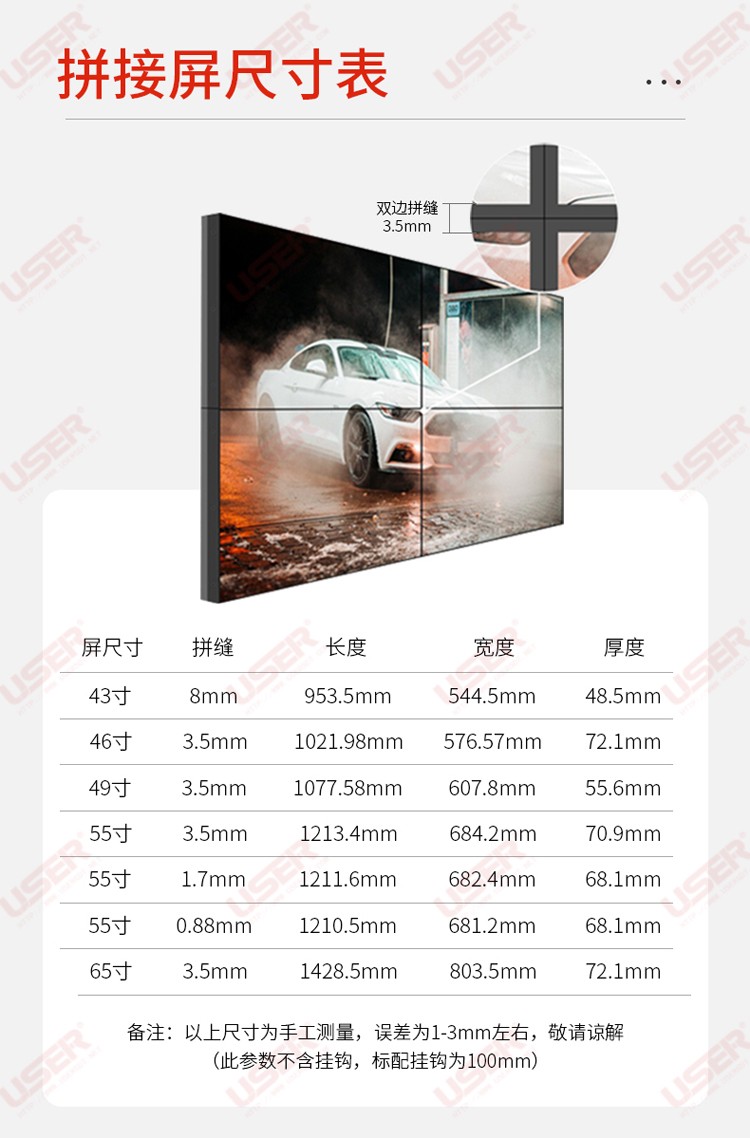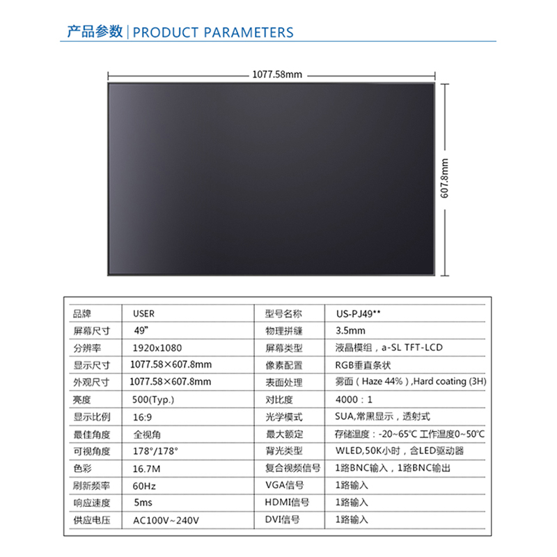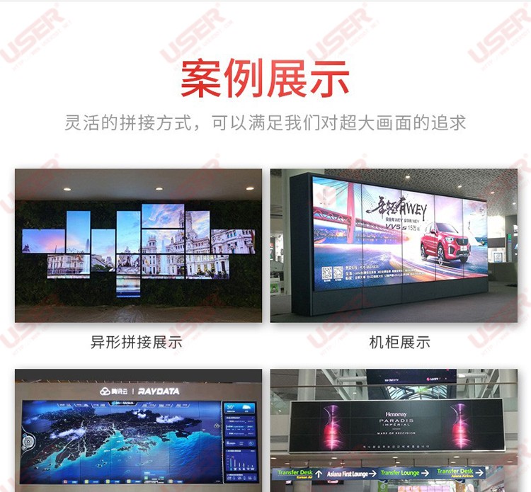 簡介:◆ 型號:US-PJ49** ◆類型:三星/LG/京東方BOE面板 ◆亮度:500-700cd/m2(可選) ◆超窄邊設計,拼縫3.5mm ◆ 在ISO9001嚴格的質量控制體系下生產? ◆ 色彩均勻,圖像穩定,為拼接大畫面定制...